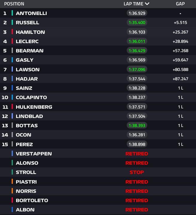 Tako je nakon kruga Andrea Kimi Antoneli imao prvo mesto ispred Džordža Rasela, Luisa Hamiltona, Šarla Leklera, Pjera Gaslija, Frenka Kolapinta, Liama Losona, Estebana Okona, Arvinda Lindblanda i Maksa Verštapena koji je imao dosta loš start, dok takođe Oskar Pjastri i Lando Noris nisu uspeli da startuju. Holanđanin u Red Bulu i Arvind Lindbalnd imali su jedan duel na prilazu za prvu krivinu, gde je Maks Verštapen malo izleteo sa staze ali je uspeo da nastavi da vozi.