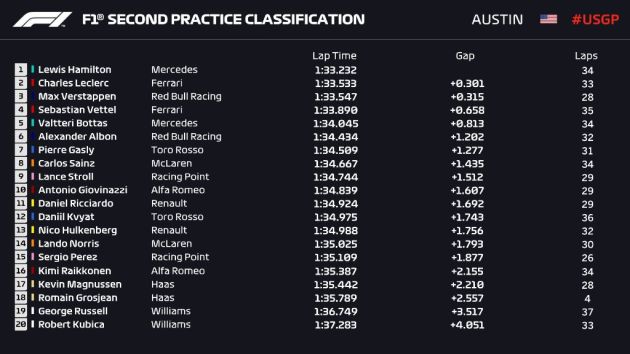 Na 13 minuta do kraja beležimo okretanje Sebastiana Vettela na prilazu za 14. krivinu, ali je Nemac bez problema nastavio trening. Samo koji momenat kasnije sličn situacija zadesila je i Daniila Kvyata ali bez većih posledica za Rusa i Toro Rosso. Do kraja treninga nije bilo nekih većih promena, pošto su vozači vežbali svoj trkački tempo pa je Hamilton zadržao prvo mesto ispred Leclerca i Verstappena. Vettel je bio četvrti, Bottas peti dok je Albonu pripala šesta pozicija. Gasly je je bio sedmi a do desetog mesta naređali su se još i Sainz, Stroll i Giovinazzi.