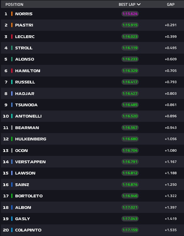U završnih 15 minuta vozači su rešili da koriste već upotrebljene medijum pneumatike kako bi još jednom oprobali trkački tempo. Do kraja treninga učinak se nije menjao, gde je Lando Noris uspeo da zadrži prvu poziciju ispred Oskara Pjastrija i Šarla Leklera, dok su se iza njega nalazili Lans Strol i Fernando Alonso. Na šestoj poziciji bio je Luis Hamilton, sedmi je vbio Džordž Rasel, osmi, Isak Hađar, deveti Juki Cunoda i deseti je bio Andrea Kimi Antoneli, dok se tek na 14. mesto našao Maks Verštapen.