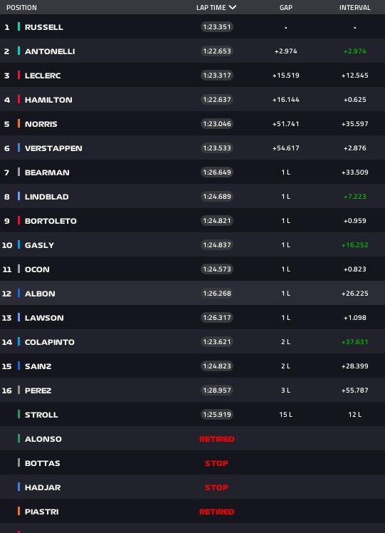 U 18. krugu smo videli još jedno odustajanje na stazi kada je Botas parkirao Kadilak u poslednjoj krivini. Verstapen, Lindblad i Berman. Ferariji su ranije već prošli ti zonu, tako da nisu mogli u boks, a šansu nisu imali ni u sledećem krugu pošto je ulazak u pit-lejn bio zatvoren. Oni su ipak još ranije odlučili da voze svoju trku i fokusiraju se na trku sa sigurnim jednim pit-stopom.